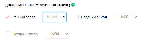 На этапе заполнения данных туристов в корзине вы можете выбрать дополнительную услугу, указав нужные вам значения. Обратите внимание: услуга предоставляется под запрос за дополнительную плату после согласования с объектом размещения. Для гарантированного получения услуги «Ранний заезд» или «Поздний выезд» вы можете оформить дополнительные сутки проживания.