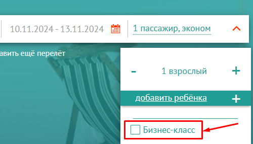 На странице поиска в окне выбора количества пассажиров поставьте галочку рядом с надписью «Бизнес-класс». В поиске отобразятся все доступные варианты этого класса перелета.